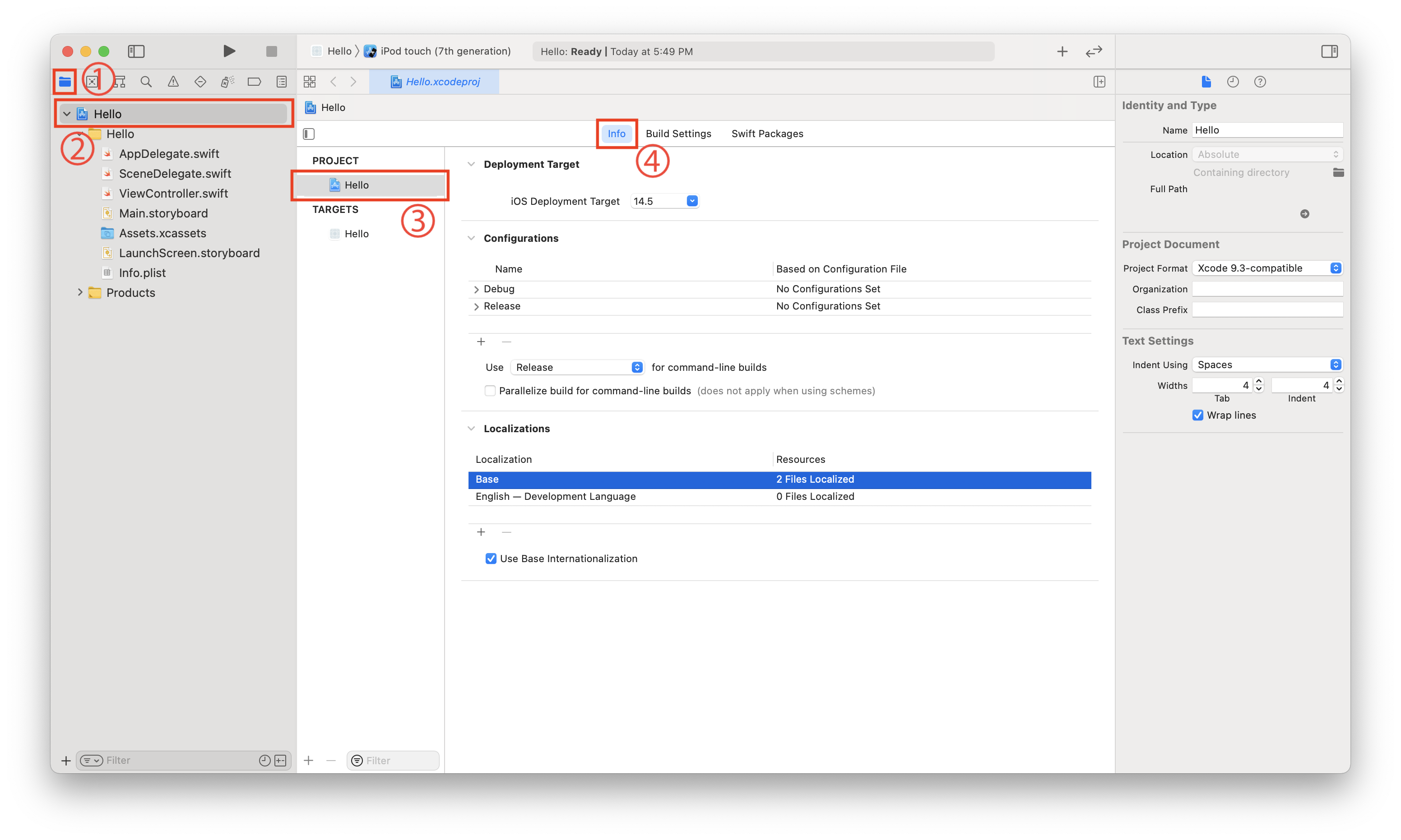 Xcode의 좌측 프로젝트 내비게이터(Project navigator)에서 최상단 항목인 프로젝트를 선택한다. 그 다음 우측 편집 화면에서 프로젝트 이름을 선택한 후 [Info] 탭을 클릭한다.