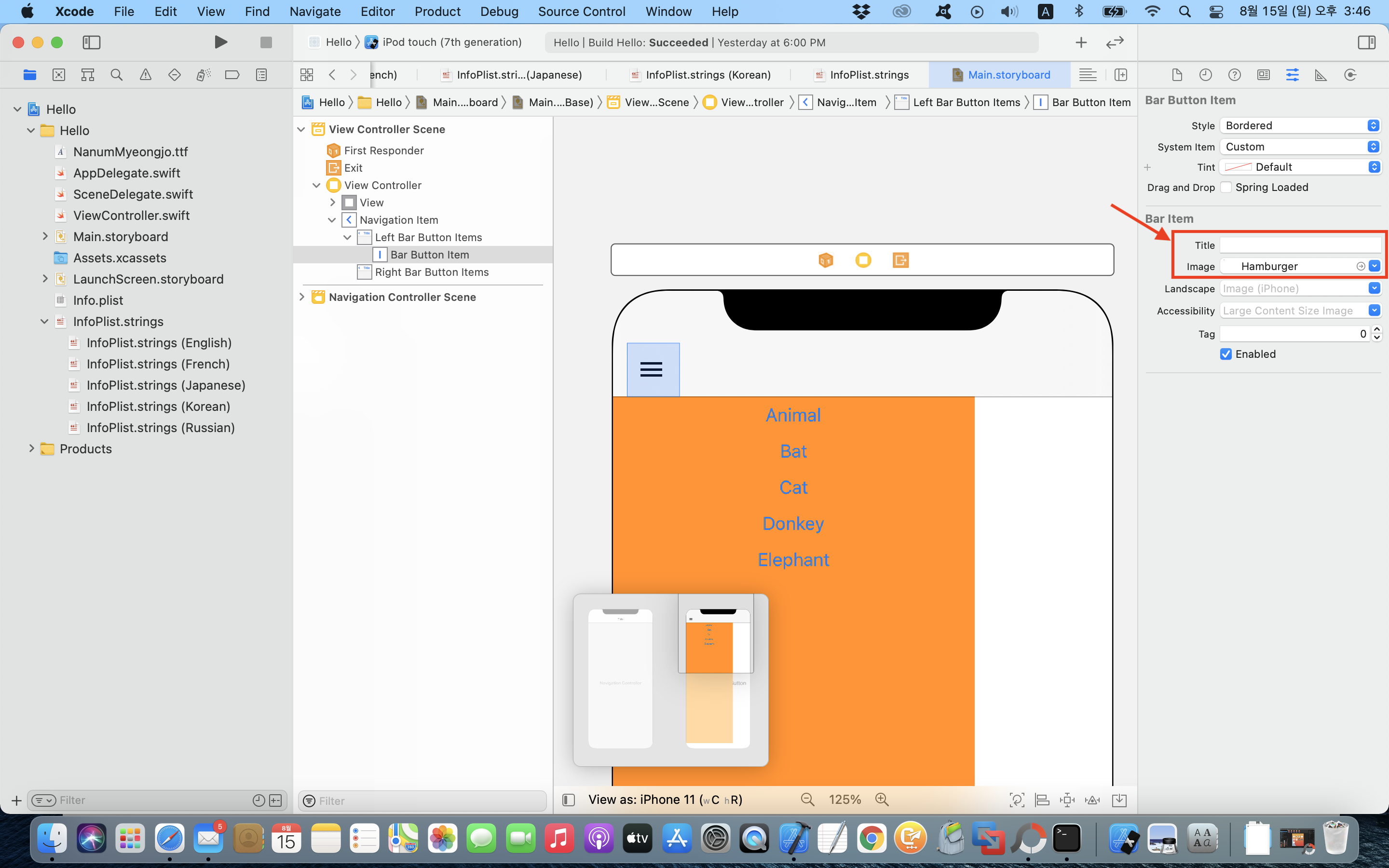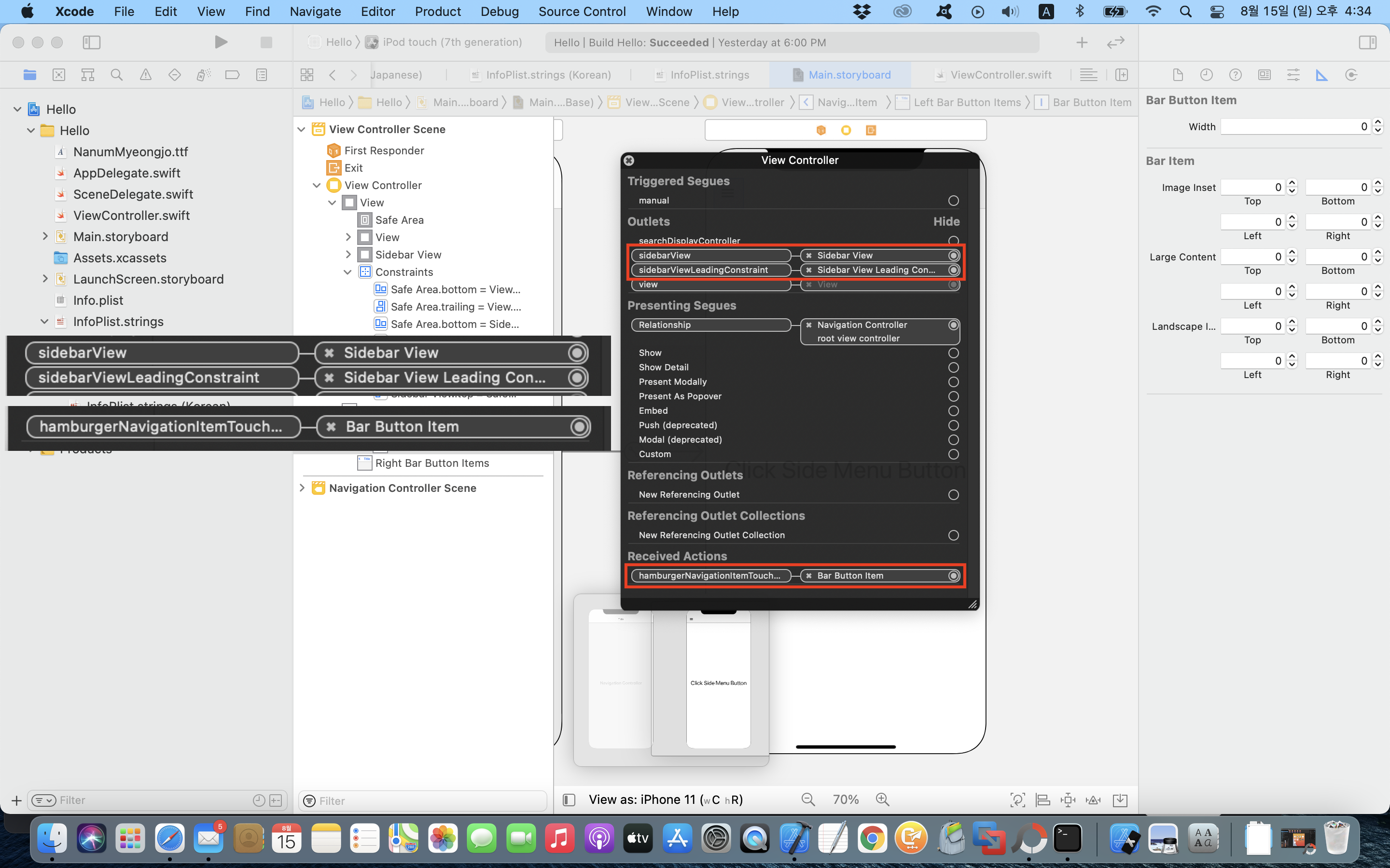 그 다음 네비게이션 바의 좌측에 햄버거 버튼을 추가한다. 햄버거 버튼에 사용할 이미지를 구해서 넣는 과정까지는 생략한다. 혼동하지 말아야 할 것은 내비게이션 바에 추가되는 버튼의 형식은 UIBarButtonItem이라는 것이다. 이것을 내비게이션 바의 좌측에 추가한다.