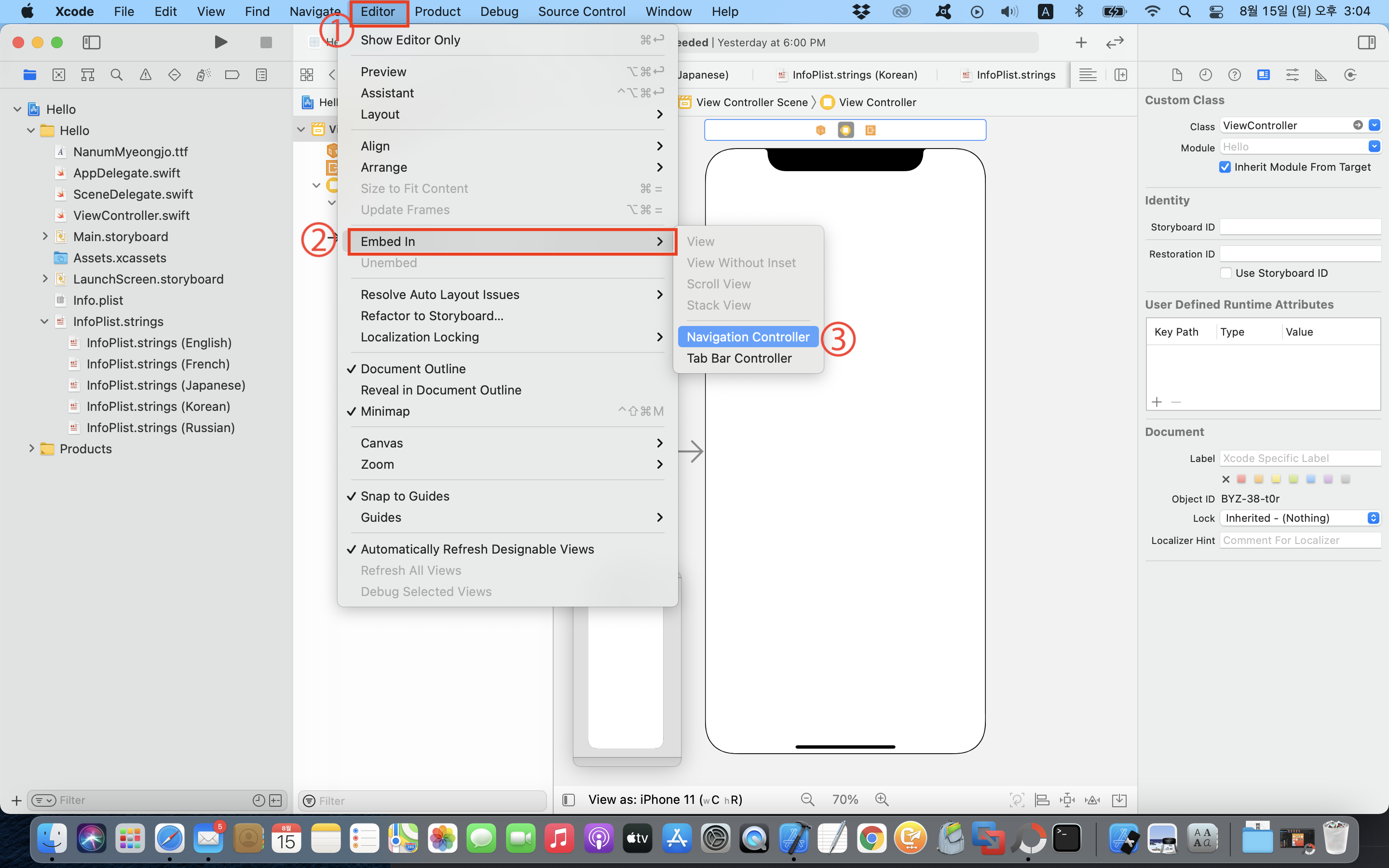 앱 화면의 상단에 햄버거 버튼을 만들어야 하므로 앱의 인터페이스에 내비게이션을 적용한다. Xcode에서 기본으로 만들어 준 뷰 컨트롤러를 그대로 둔 채 [Editor] - [Embed In] - [Navigation Controller]를 클릭한다.