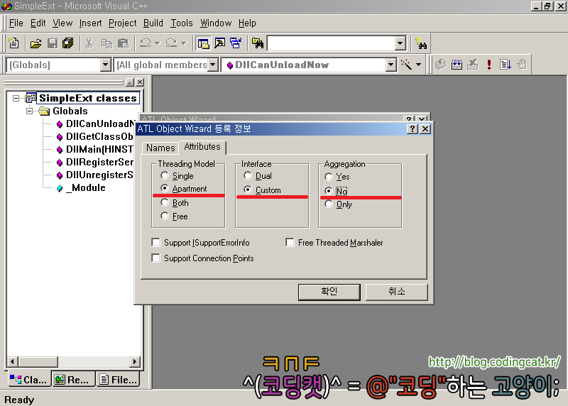 기본적으로 이 마법사는 C에서도 사용 가능하고, OLE Automation을 통해 스크립트 기반 언어에서도 사용할 수 있는 COM 객체를 생성하게 됩니다. 우리의 쉘 익스텐션은 Windows 탐색기에서만 사용될 것이기 때문에 우리는 몇 가지 설정들에 대해 Automation 관련 기능을 제거하도록 수정할 수 있습니다. 우선 ‘Attribute’ 페이지로 이동하여 ‘Interface Type’을 ‘Custom’으로 변경 후 ‘Aggregation’에 대해 ‘No’를 선택합니다.