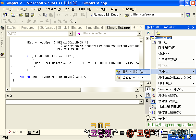 [확인] 버튼을 누르면 마법사는 COM 객체를 구현하기 위한 기본 코드가 포함된 CSimpleShlExt 클래스를 생성하고 이를 현재의 프로젝트에 추가할 것입니다. 이 클래스에 우리는 추가적으로 코딩을 하게 될 것입니다.