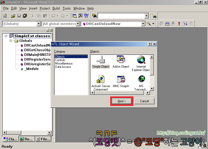 ATL Object Wizard 화면에서 첫 번째 단계는 이미 “Simple Object”라는 것을 선택하고 있습니다. 그냥 [Next >] 버튼을 클릭합니다.