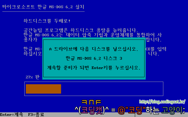 계속하여 '다음 디스크'를 넣어주면서 Enter키를 누른다. 간혹 나오는 홍보문구들이 당시의 컴퓨터 환경을 잘 말해주는듯 하다. 무엇보다도 하드 용량과 램 용량 확보에 사활을 걸었던 시대였다.